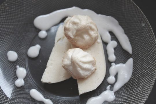 Dessert: Weiße-Schokolade-Parfait, Baiser und Lychee-Kokos-Soße