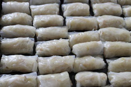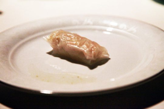 Amuse Gueule: Mini-Sommerrolle mit Süß-Sauerkraut und Sprossen an weißer Chilisauce