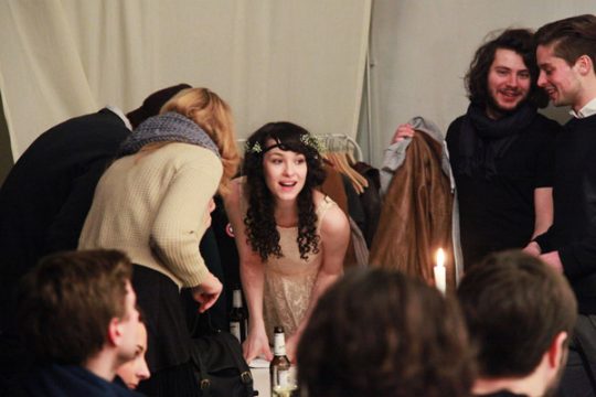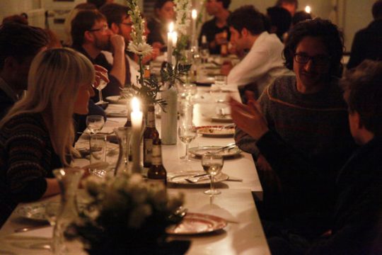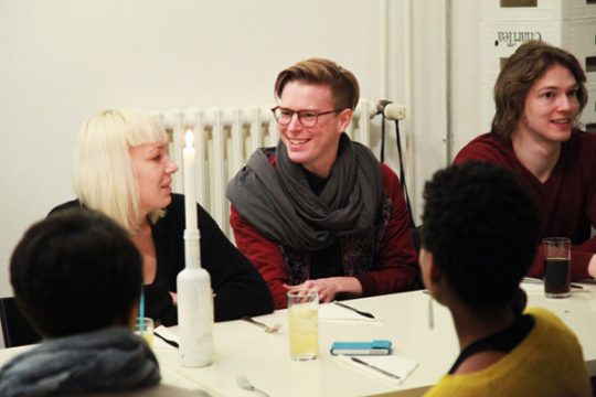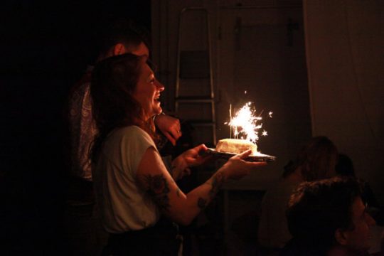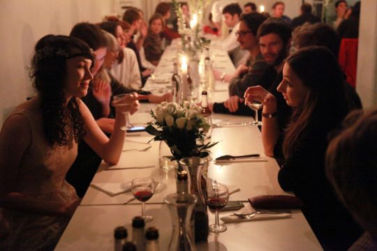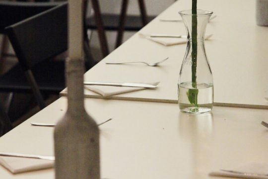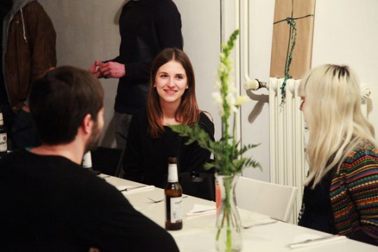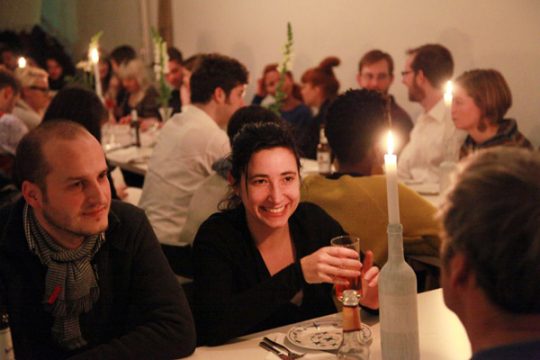 Die Tische der Galerie Merkezi in Kreuzberg wurden schlicht mit weißen Blumen, Flaschen und Kerzen geschmückt, die Gäste erschienen zahlreich, es waren (am Ende hoffentlich) satte 45 an der Zahl. Eine stattliche Geburtstagsgesellschaft war darunter, die Jubilarin passend in Weiß mit Blumenschmuck auf dem anmutigen Haupt.