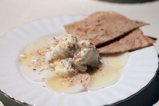 Vorspeise: Rettich-Carpaccio mit Büffelmozarella, weißer Balsamico-Pfirsich-Reduktion und Tahin-Bohnenmehl-Fladenbrot