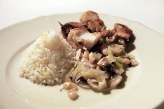 Hauptgang: Weißes Mischgemüse, Mandelreis, falsches Hühnchen in Weißwein-Knoblauch-Soße