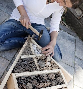 - Für jene, die weniger leidenschaftlich heimwerken, empfehle ich die »Nützlingshaus-für-ungeschickte-Kreative«-Variante: Findet Dinge, die befüllt werden können – ein hohler Baumstumpf, ein hölzener Weinkarton, ein Blechkübel. Den Viechern ist es egal, ob ihr Haus wie ein Haus aussieht, Hauptsache, die Möblage stimmt!