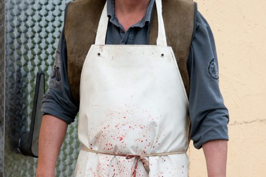 Die Schlachtung und Verarbeitung übernehmen zwei Metzger der Fleischerei Wimmer, die stolz darauf sind, ihr traditionsreiches Handwerk noch in dieser Form ausüben zu können. Während sich die meisten ihrer Kollegen heute nur noch als Veredler oder Händler von Industriefleisch verstehen, verarbeiten sie Tiere noch von der Weide bis zur Ladentheke. Schlachtung und Schlachtung sind nicht dasselbe. Soviel wird deutlich. Zur Überwachung der Schlachtung und zur Untersuchung des Fleischs ist ein Veterinärmediziner vor Ort. Alles nach Vorschrift.