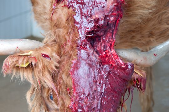 Das Tier wird an Haken befestigt und die Metzger erledigen ihre Arbeitsschritte. Der Anblick des rohen Fleisches, die extremen Gerüche, die Wärme des offenliegenden Körpers, das spritzende Blut, der aufsteigende Dampf, das alles hat etwas Archaisches. In kurzer Zeit werden aus der Kuh Harley zwei Rinderhälften, die im Raum hängen. Die Abstraktion einer Kuh – so wirkt es.