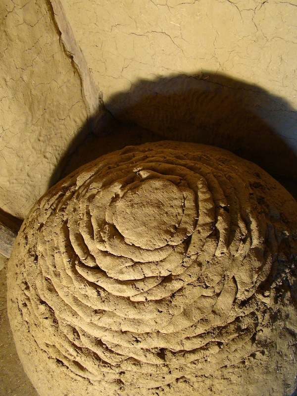 Aus dem Lehm werden Bausteine in der Größe von Brotlaiben geformt, die entlang der Grundrisslinie aufgebaut werden. Ring für Ring arbeitet man sich in die Höhe. Die Wandstärke beträgt 15–20 cm. Vorne wird die Öffnung gebaut.