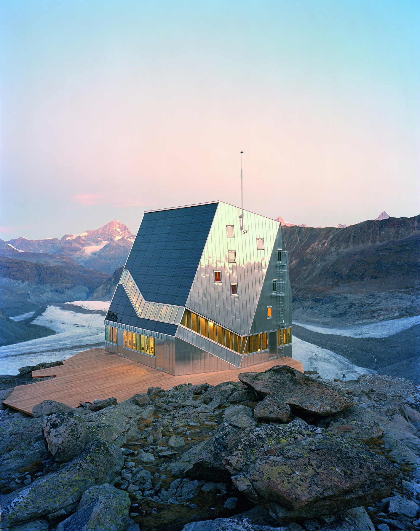 - Monte Rosa Hütte © ETH Studio Monte Rosa/Tonatiuh Ambrosetti: Die exponierte Lage der neuen Monte Rosa Hütte auf 2883 Metern Höhe stellte extreme Anforderungen an Konstruktion, Hülle und Versorgung des Gebäudes, das in nur wenigen Monaten im Jahr 2009 entstanden ist.