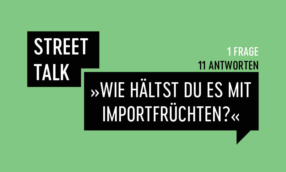 Essen & Trinken Lesezeit: 0m 4s BIORAMA Street Talk von Die Redaktion · 8. März 2022 Wie hältst du’s mit Importfrüchten? #Bio#Exotisch#Gemüse#Importfrüchte#Obst#Regional#saisonal#Transportweg