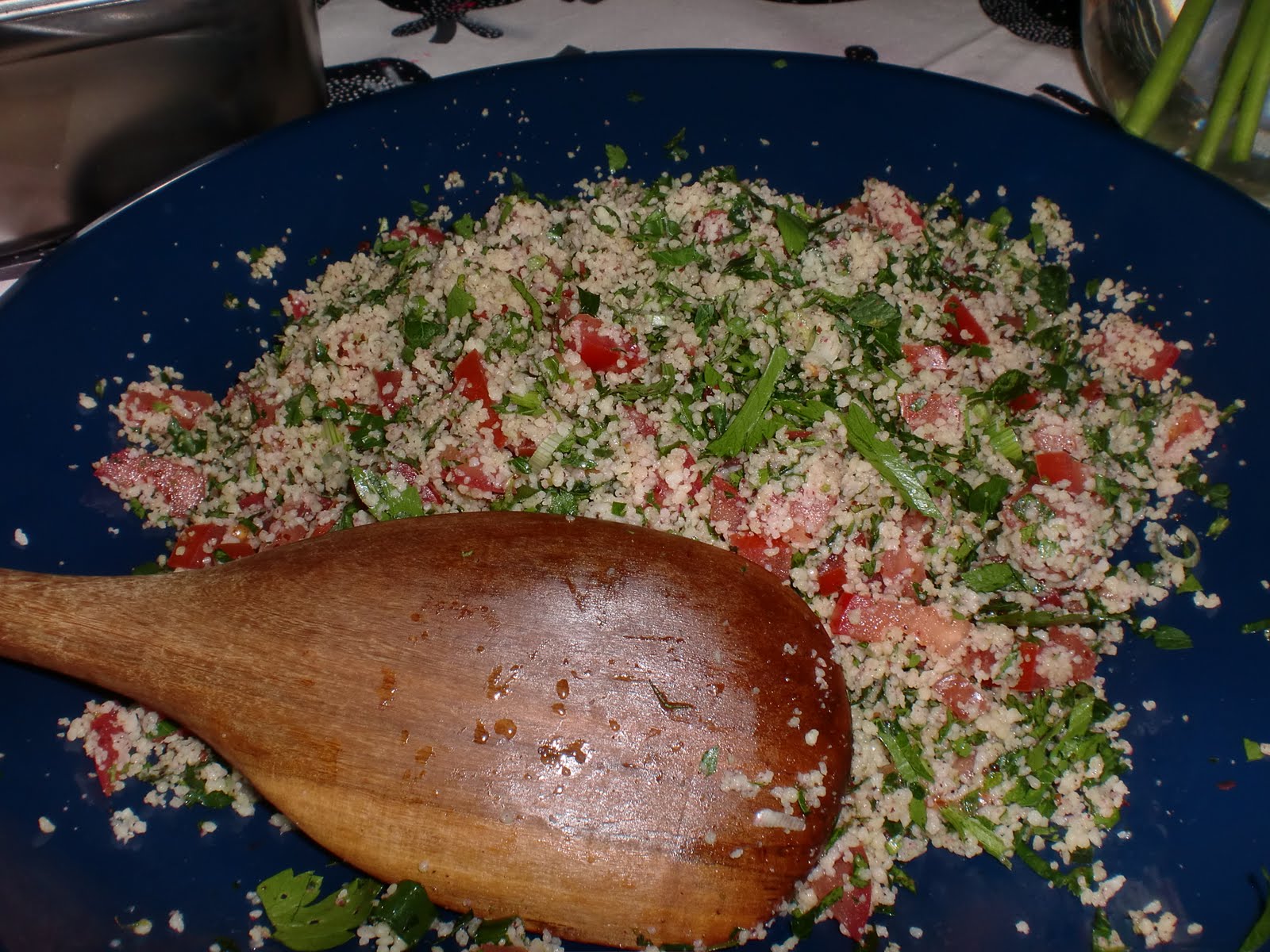 * 250 g couscous oder bulgur, 1 zu 1 mit heißem wasser und etwas salz quellen lassen, dann mit einer gabel auflockern