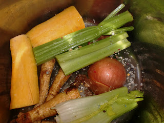 * wurzelgemüse: karotte/gelbe rübe, petersilwurzel, sellerie => grob geschnitten