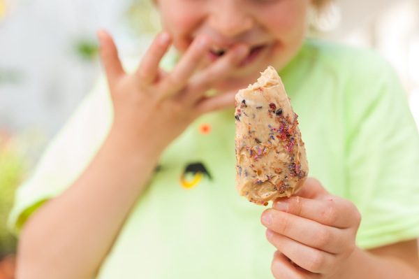 Erdnussbutter, einen Spritzer Zitronensaft, Zuckersirup und Wasser gut verrühren, abschmecken und mit Kakaonibs vermischen. Den gefrorenen Eislutscher in »Alles Liebe«-Gewürzmischung von Sonnentor wenden.