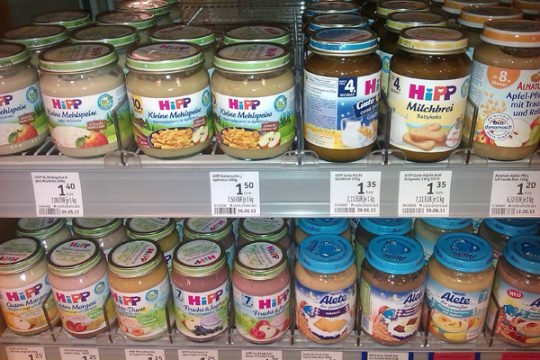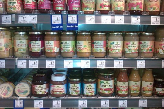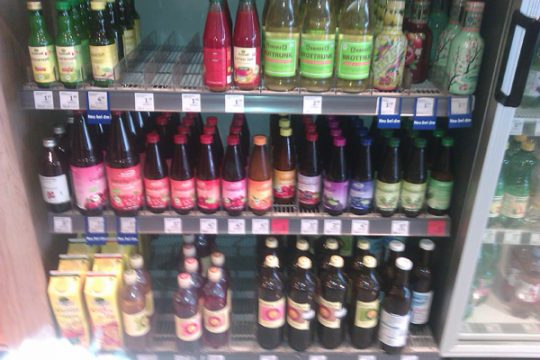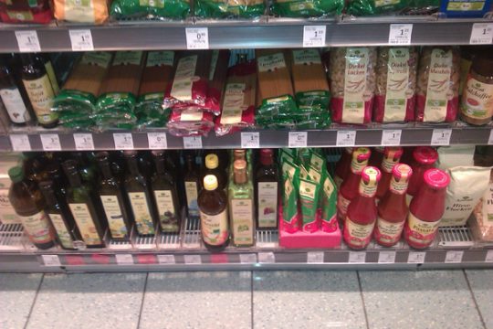 Positive Überraschung am Eingang: Säfte, passierte Tomaten, Öl und Essig, das meiste davon in Glasflaschen, Babynahrung, Sugos und Aufstrich, meist im Glas.