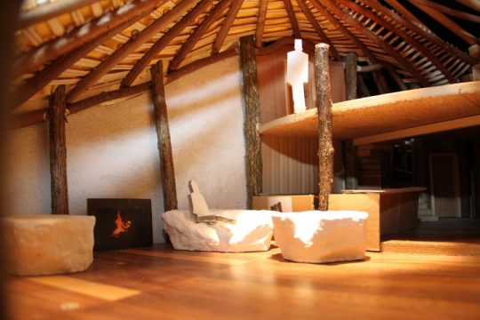 Heißt, dass Materialien möglichst unbearbeitet verwendet werden, die vor Ort zu finden sind. Ebenso achtet das Team auf nachwachsende Rohstoffe. Das Innenleben des Hauses besteht aus einem einzigen Raum, wo lediglich Kokons als Rückziehorte verwendet werden.