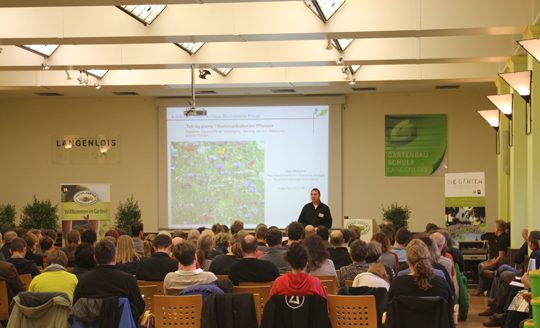 Fiona Kiss: Die Gestaltung von Grünflächen, Parkplätzen, Sickermulden und Firmenportalen, aber auch die Themen Ökologie auf dem Golfgreen, Alternativen zu Rasenherbiziden und pflegeextensive Begrünung von Flächen mit Pflanzungen und Ansaaten wurden vorgestellt. Weiter berichteten pestizidfreie „Natur im Garten“-Gemeinden von ihren Erfahrungen in der ökologischen Pflege und es gab einen Vortrag zum Thema „Bäume im Klimawandel“. Auch deren klimawirksame Faktoren für Städte wurden vorgestellt. Das Julius-Kühn Institut aus Deutschland stellte u.a. Süßholzblätterextrakt als zukunftsträchtiges Bio-Fungizid dar. Ein Beitrag des Max-Planck-Instituts über Kommunikation unter Pflanzen rundete den wissenschaftlichen Teil der Vorträge ab. Wie sich Pflanzen untereinander vor Schädlingen warnen, und sogar andere Pflanzenarten belauschen können, ist auch für den Pflanzenschützer interessant. Kann man doch bereits jetzt durch abgegebene und analysierte Warnstoffe der Pflanzen auch auf einen Schädlingsbefall schließen.