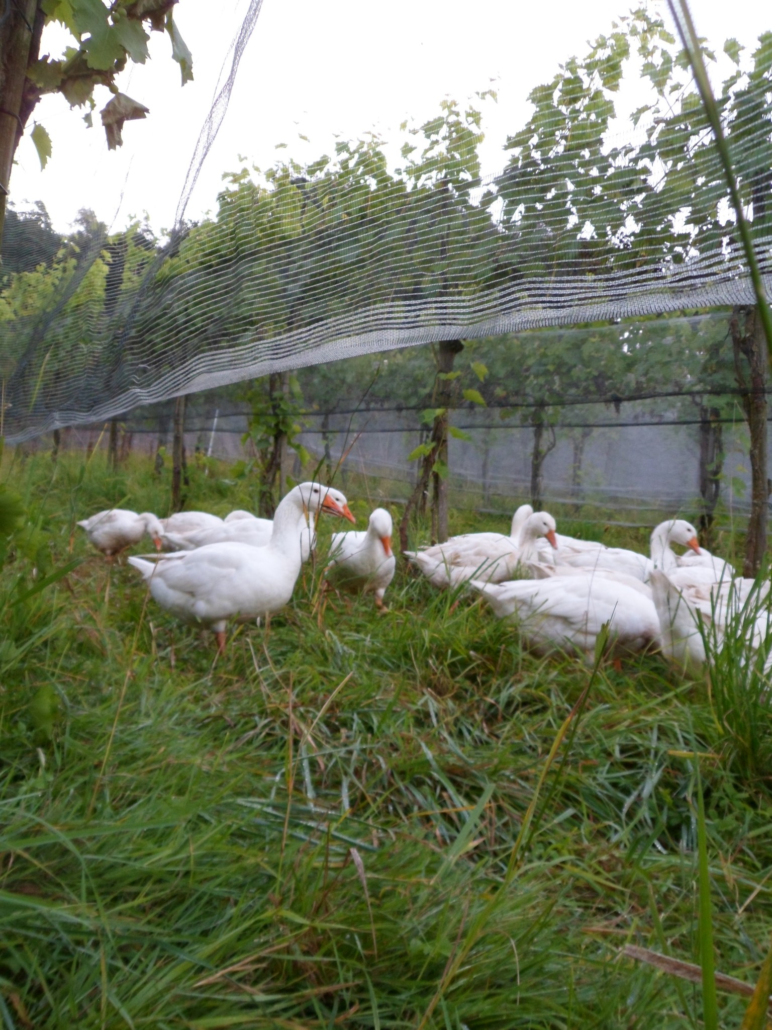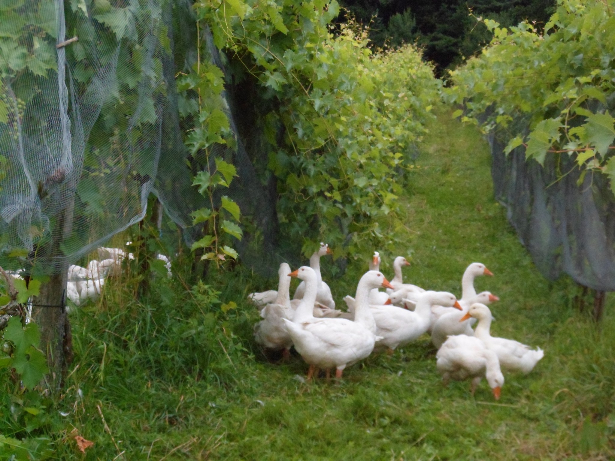 Fredi Strasser: Nein, wir waren nur unsicher, ob wir Probleme mit dem Fuchs oder mit Traubenfraß durch die Gänse haben würden. Da wir die Gänse im fahrbaren Stall über Nacht gesichert haben, hatten wir kein Fuchs-Problem. Da unsere Reben auf 1.4 m Höhe gezogen werden, war auch das Traubenpicken durch die Gänse nicht möglich.