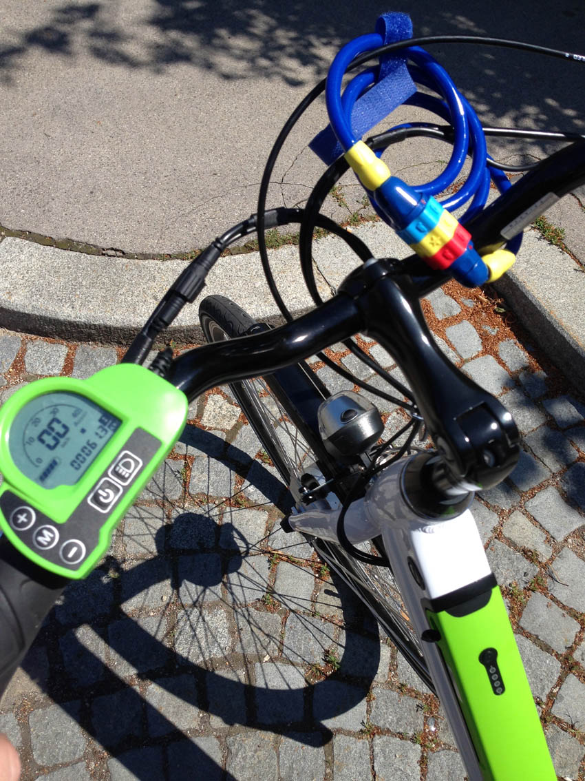 Aber jetzt wollte ich einfach mal fahren. Voll geladen ist es, die Lichter an der grünen Batterie sind alle erleuchtet und das ebenfalls grüne Steuerungsdisplay leuchtet bereits. Hier gibt es auch eine Ladestandanzeige, einen Kilometerzähler und die Geschwindigkeitsanzeige. Mit der Plus- und der Minustaste kann der Fahrer die Motorunterstützung steuern. Der Motor treibt übrigens das Vorderrad an, während die eigene Muskelkraft nur direkt auf das Hinterrad wirkt. Im vollen Unterstützungsmodus merkt man also wie man gezogen wird. Ein Gefühl, dass mich nach längerer Fahrt auch danach abseits des Rades noch verfolgt. Ist wie wackliger Boden, nachdem man von einem Schiff geht. Komisch eigentlich. Der Vorderradantrieb macht auch das Lenken etwas schwieriger. Überhaupt fühlt sich die Lenkstange viel zu fragil an im Gegensatz zur restlichen Konstruktion.