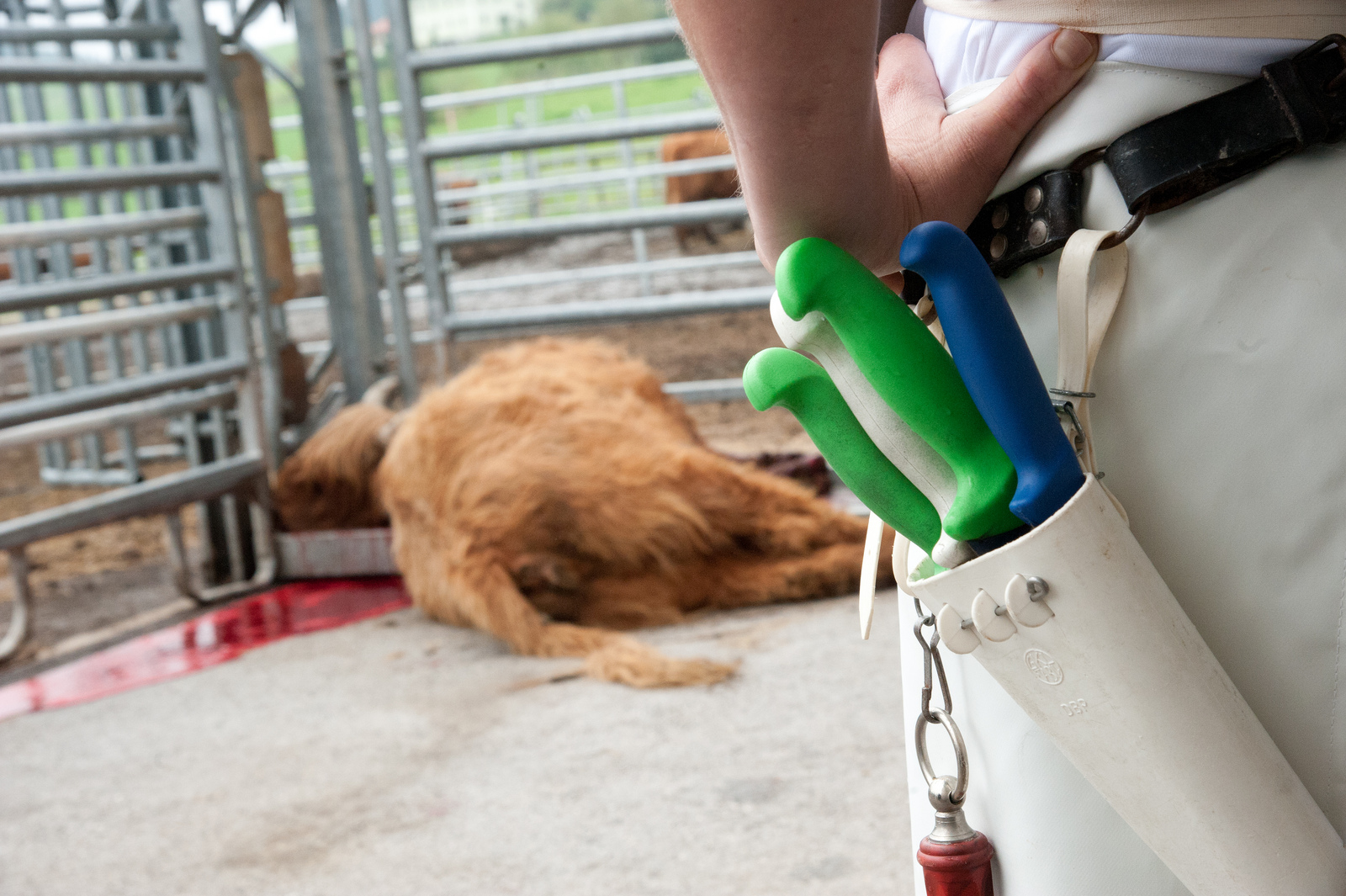 Rind Harley wird von Landwirt Hugo Lucian in aller Ruhe in eine enge Box aus Stahlrohren geführt. Dann schießt man ihr mit dem Bolzenschussgerät ins Hirn und sie sinkt zu Boden. Diese Form der Betäubung ist üblich. Kritiker befürchten allerdings, dass dabei viel zu oft das Hirn der Tiere verfehlt wird – gerade in Großschlachthöfen, wo viele Tiere sich nevös bewegen, und das Zielen nicht so einfach ist.