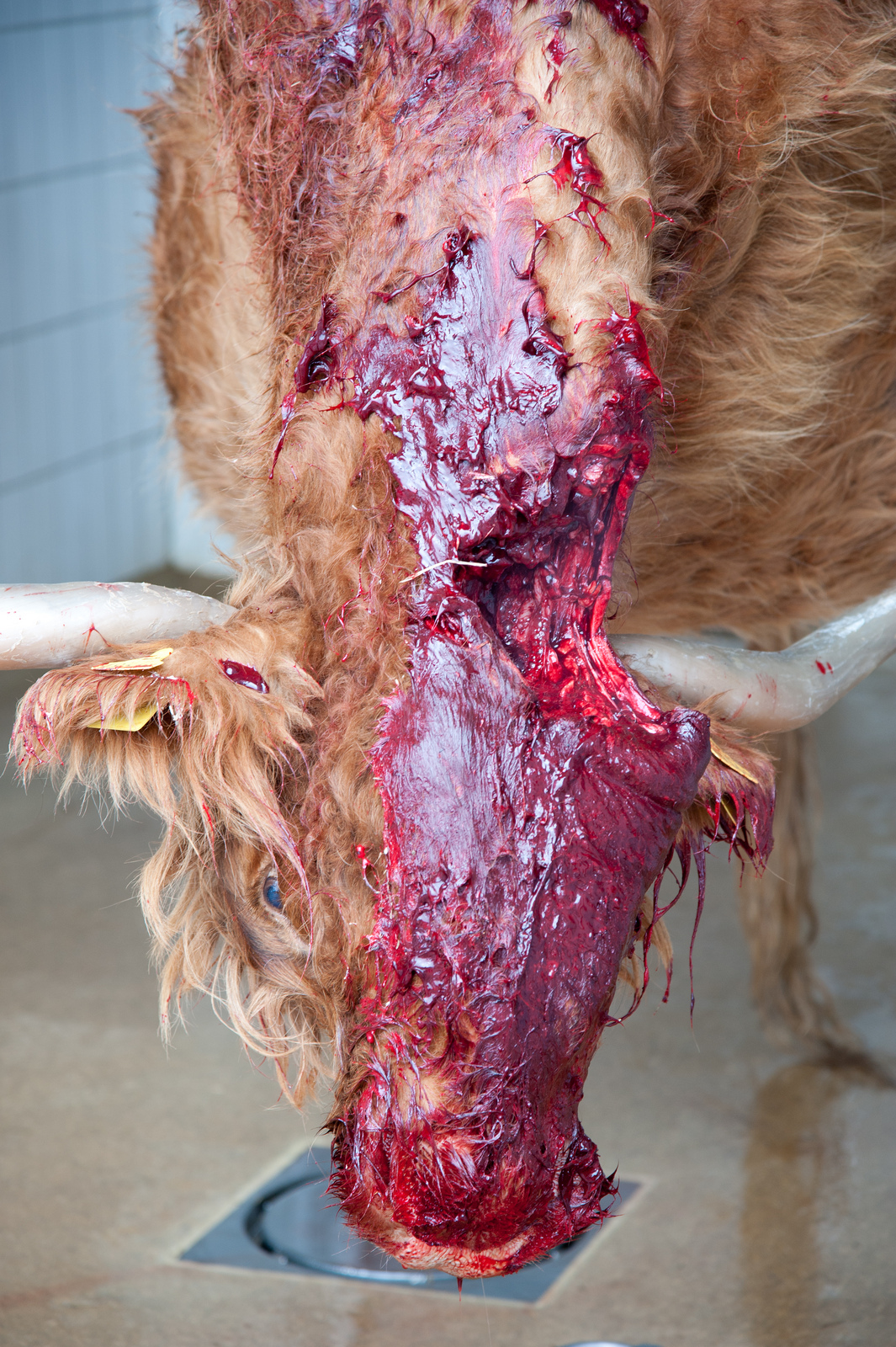 Das Tier wird an Haken befestigt und die Metzger erledigen ihre Arbeitsschritte. Der Anblick des rohen Fleisches, die extremen Gerüche, die Wärme des offenliegenden Körpers, das spritzende Blut, der aufsteigende Dampf, das alles hat etwas Archaisches. In kurzer Zeit werden aus der Kuh Harley zwei Rinderhälften, die im Raum hängen. Die Abstraktion einer Kuh – so wirkt es.