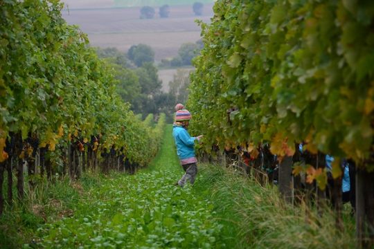 Wir lesen Wein, sortieren, quetschen die Trauben mit den Füßen und picknicken im Weinberg.