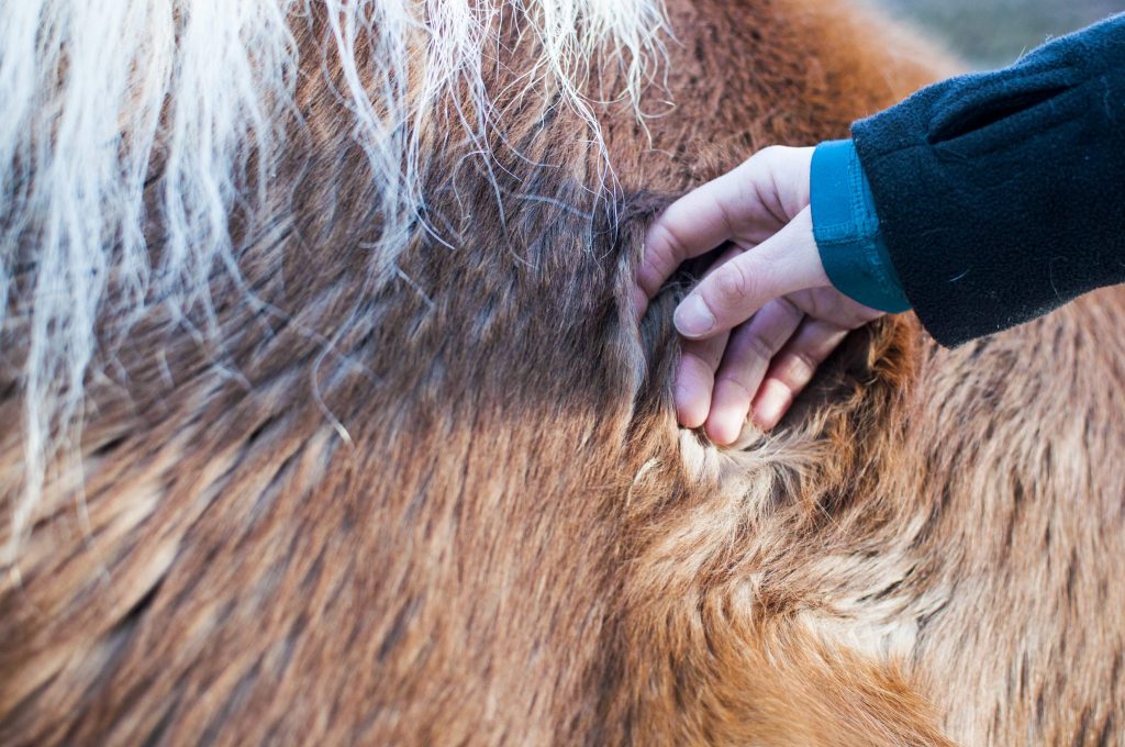 Als die Teilnehmergruppe sich am Hof einfindet, geht es sofort hinaus zu den Pferden. Jeder sucht sich eine Bürste und ein Pferd und taucht ab in seine eigene Welt. Zwei Fremde, die zusammen den Moment durchleben, kommunizieren, sich aufeinander einlassen. Die Frage, die wir uns stellen sollen – was ist Putzen eigentlich? Es geht darum, alte Gewohnheiten abzulegen, das technische, funktionale Säubern des Pferdefells zu einem absichtslosen Erfahrungsprozess werden zu lassen. Runterkommen, Erden, im Moment sein. Gedanken tauchen auf und werden wieder losgelassen. Es geht um den Kontakt mit dem Pferd, um den Kontakt zu sich selbst. Was mag das Pferd gerade, wo möchte es sich gerne von uns berühren lassen? Die Minishettystute Tamarine genießt es sichtlich, sich unter der dicken Mähne das Fell massiert zu bekommen. Hengst Merlin ist noch jung und beißt lieber in die Bürste. Der Moment wird wertfrei wahrgenommen, gesehen, gelebt. Man lässt sich auf das andere Lebewesen ein, lässt eigene Erwartungen los und Empfindungen zu. Das Putzen ist der erste Einstieg in eine meditative Haltung.
