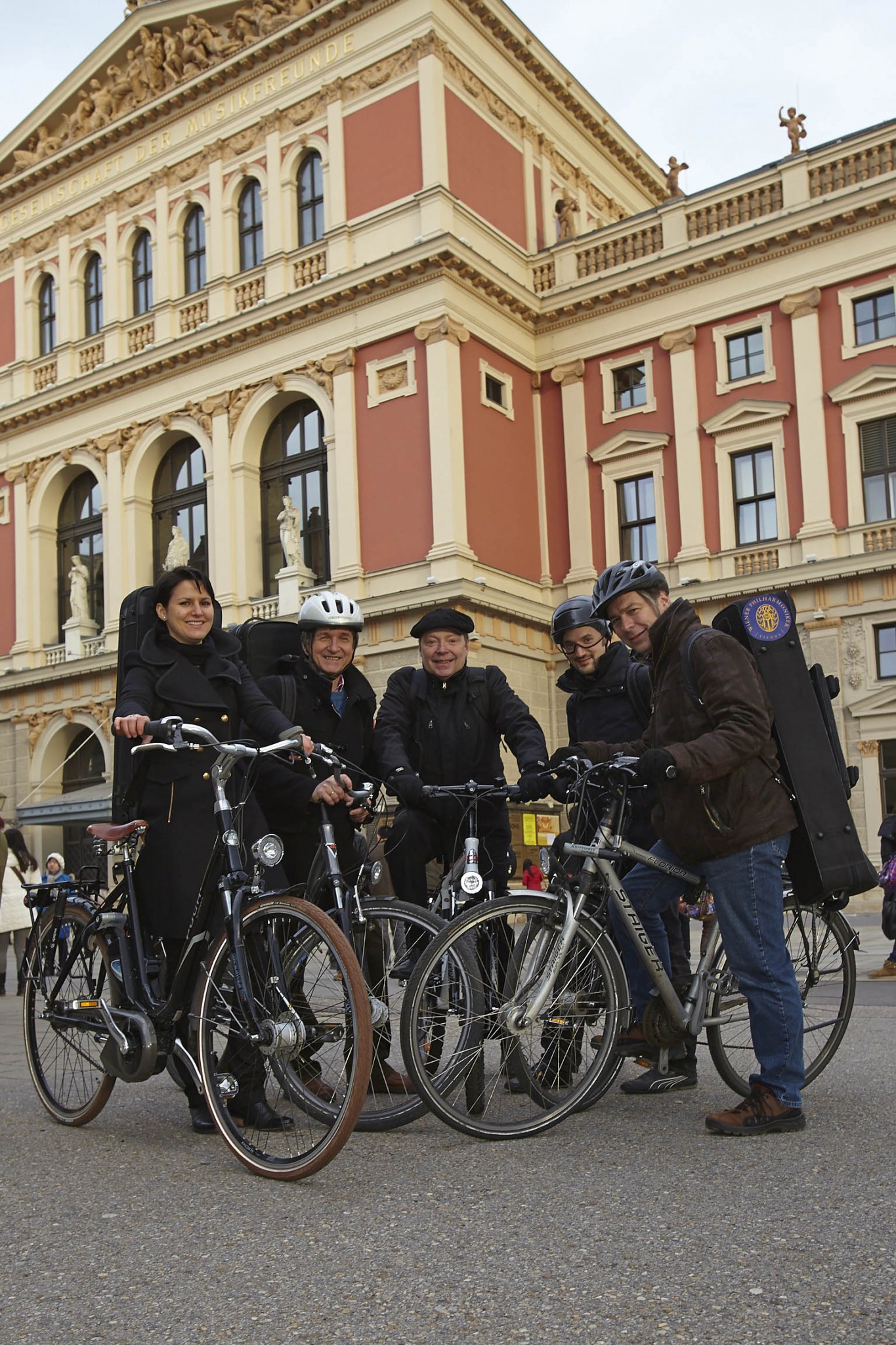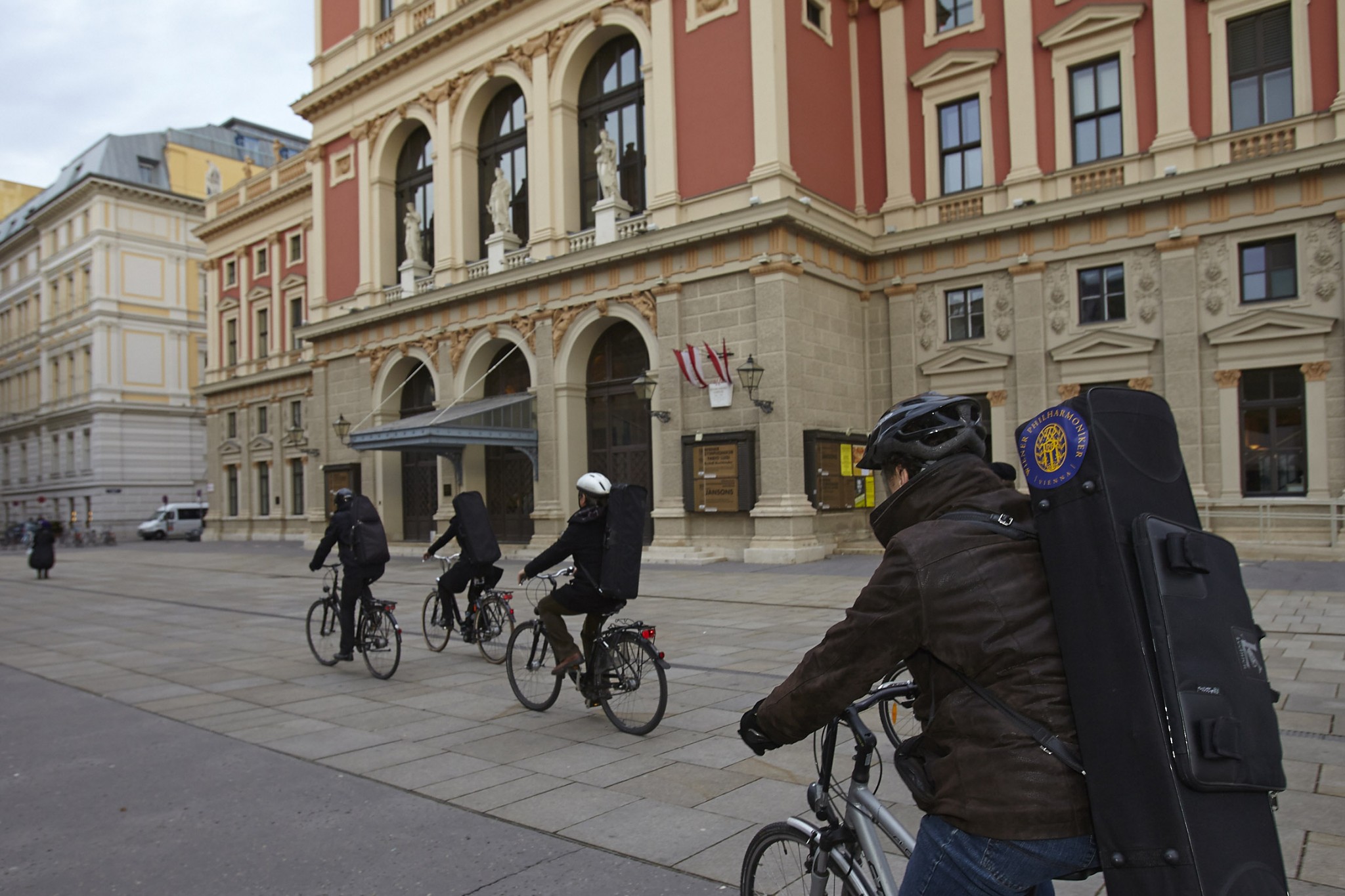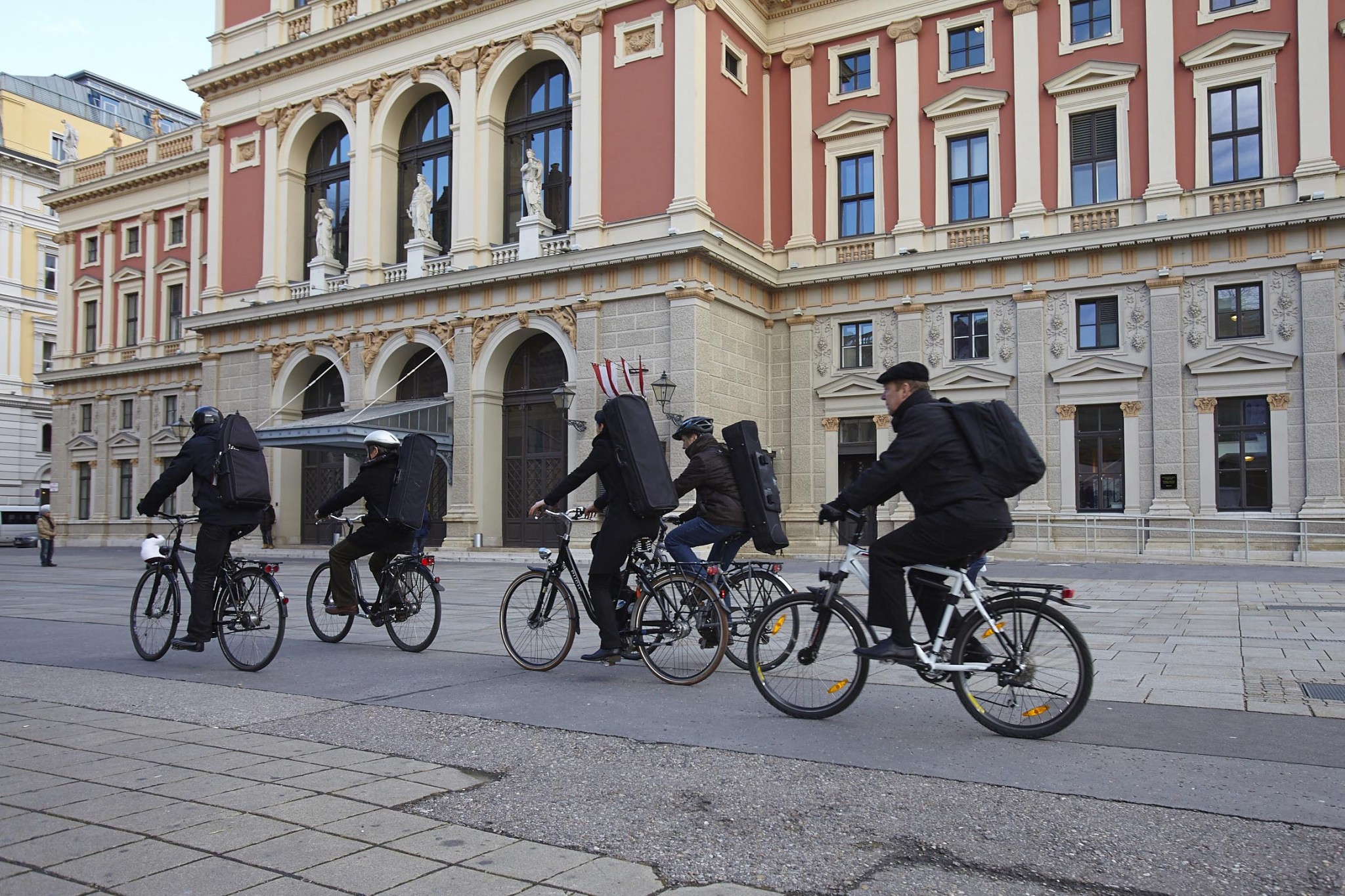 Trotz winterlicher Fahrverhältnisse radeln die Wiener Philharmoniker fast täglich mit ihren wertvollen Instrumenten im Gepäck zum Wiener Musikverein, wo die Proben zum Neujahrskonzert stattfinden – getreu dem Motto „Radfahren ist zu jeder Jahreszeit möglich“.