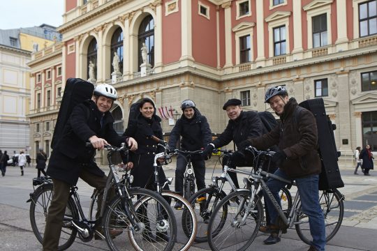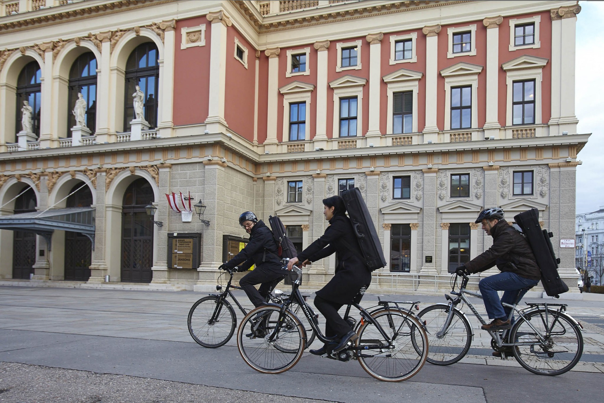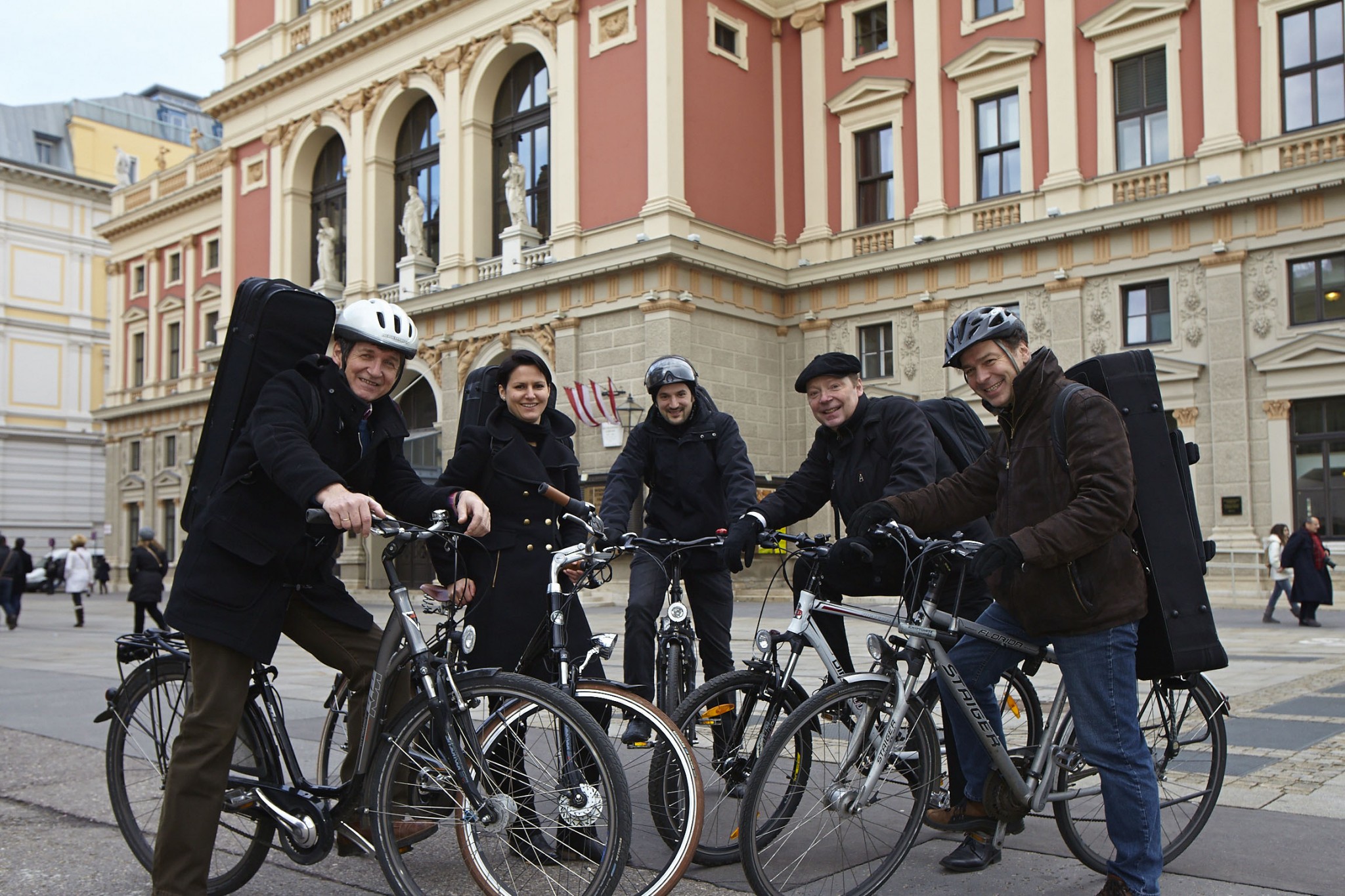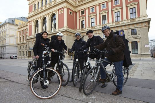 Trotz winterlicher Fahrverhältnisse radeln die Wiener Philharmoniker fast täglich mit ihren wertvollen Instrumenten im Gepäck zum Wiener Musikverein, wo die Proben zum Neujahrskonzert stattfinden – getreu dem Motto „Radfahren ist zu jeder Jahreszeit möglich“.