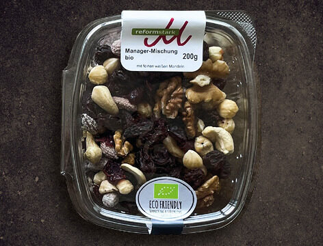 Wenn man eine Zielgruppe mit an Sicherheit grenzender Wahrscheinlichkeit nicht in einem Reformhaus antrifft, dann die Manager. Managerinnen eventuell. Aber das Reformhaus hat den Produktnamen ja nicht gegendert. Egal. Manager brauchen offenbar Energie und Nahrung fürs Hirn. Also werden gemischt: Cranberrys und Rosinen, Zuckermandeln und diverse Nüsse. Fifty-fifty. Hälfte Früchte, Hälfte Nüsse. Bild: Jürgen Schmücking.Bioheidelbeeren: