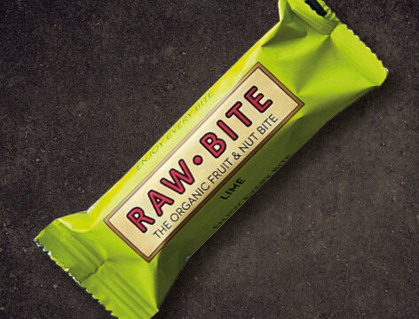 Zusatzinformation auf der Packung: »mit Proteinpulver aus Österreich«. Es ist eher ein Ziegel denn ein Riegel. Ein tiefdunkelgrüner Pressling, der am Gaumen das Gefühl hinterlässt, in eine Handvoll Futterpellets gebissen zu haben. Geschmacklich – abgesehen davon, dass der Riegel etwas trocken ist – aber gar nicht uninteressant. Diesmal sind auch Kakaobutter, Feigen und Spirulina-Algen im Spiel. Bild: Jürgen Schmücking.The Organic Fruit & Nut Bite Lime,