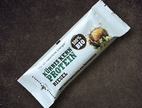 Kein Scherz. Der Riegel heißt wirklich so. Und das seit 1976. Rapunzel schreibt stolz auf die Packung: »Fruchtschnitte aus Feigen, Datteln und Mandeln. Und sonst gar nichts.« Die Zutatenliste verrät allerdings, dass auch etwas Reismehl verwendet wird. Quasi als Bindung – und in homöopathischen Mengen. Also geschenkt. Geschmacklich ist das Leckerli ausgesprochen gut. Es schmeckt leicht nach Honig und intensiv nach Nüssen. Dass mit diesem Namen auch nur ein einziger Riegel in Österreich verkauft wurde, grenzt an ein Wunder. Oder es spricht für das Produkt. Bild: Jürgen Schmücking.KürbisKern-Protein-Riegel,