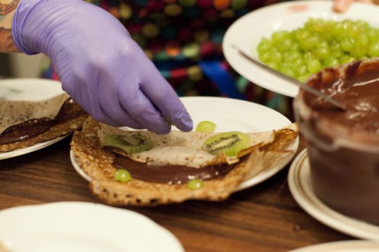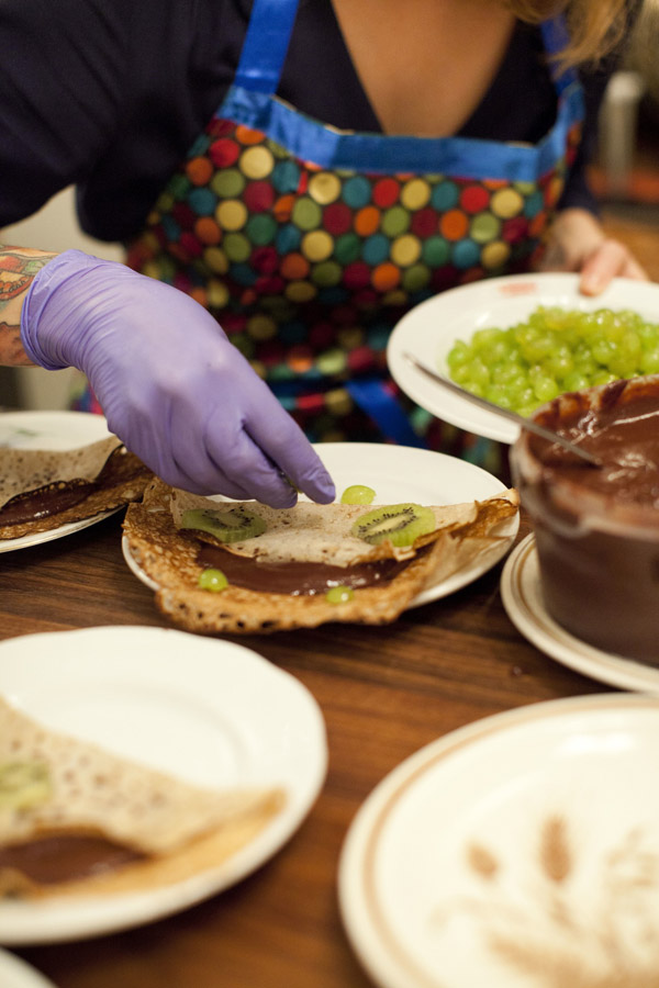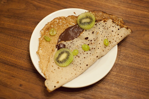 Dessert: Buchweizen-Crepe mit Kiwi- und Trauben-Punkten und selbstgerührter Nutella