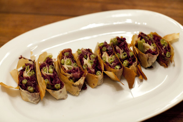 Amuse Gueule: Pikanter Strudel mit Kokos-Rotkohl und grünen Bohnen-Punkten