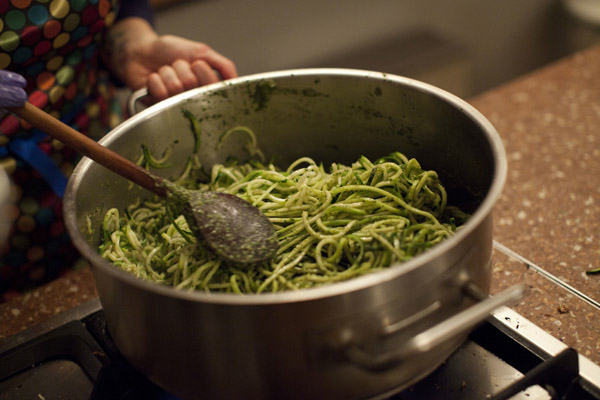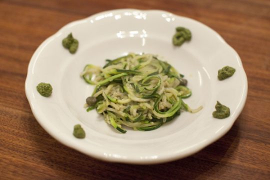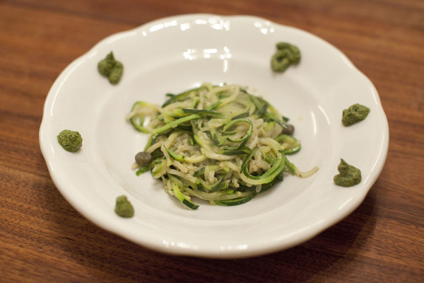 Starter: Zucchini-Pasta mit Kapern und selbstgemachten Pesto-Punkten