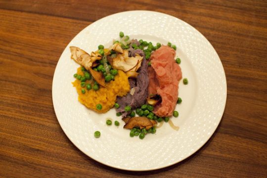 Hauptgang: Dreierlei Pü (Masala-Süßkartoffel/Alpensalz-Blaukartoffel/Kartoffel-Steckrübe-Pinkie) mit glasigen Erbsen-Punkten und Knusperapfel