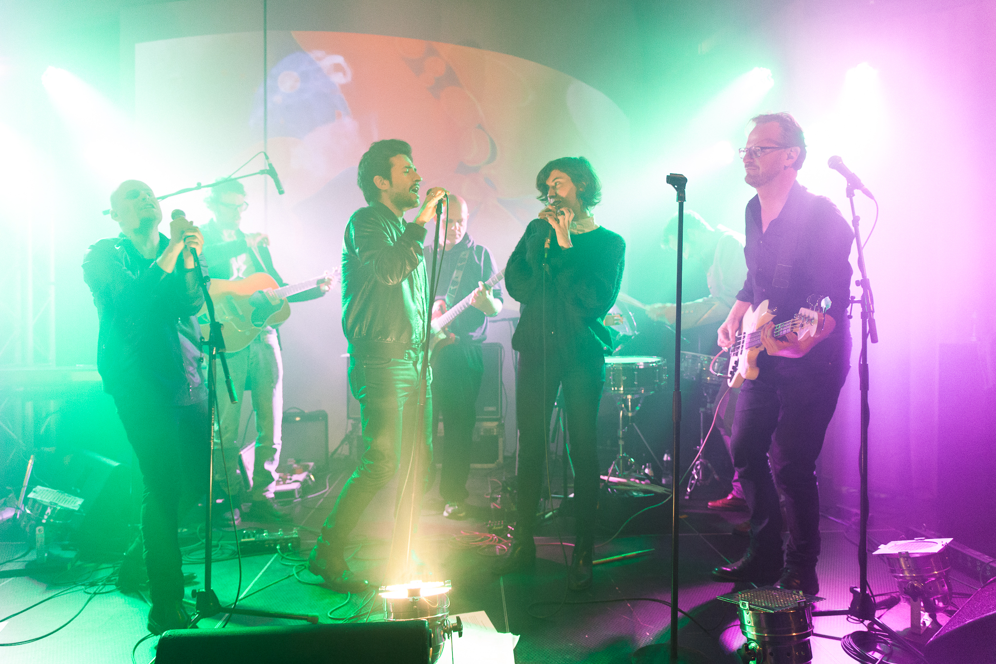 Was Christian Fuchs und David Pfister, die beiden Köpfe der Band Die Buben im Pelz, textlich vollbringen ist nicht weniger als eine zeit- und sinngemäße Transformation der Lou Reed Lyrics des ersten Velvet Underground Albums ins Wienerische. Es ist ein theatralisches Konzert, mit Rock’n’Roll-Gesten, guten Gastmusikern und trashigen Visuals. Die Freundinnen geben dem Ganzen eine gute Form, es wirkt wie eine Art Staffellauf der Klischees und ist eine Verbeugung vor denen, die solcherlei vorher schon praktizierten: schwitziger Hände-Rock und Performance in Leder mit Schmerz und Pathos. Die Performerinnen und Performer wirken familiär miteinander: Dorit Chrysler gibt die Nico 2.0 mit einer großen Eleganz, sie haucht „Olle faden Parties“ („All Tomorrow’s Parties“) und meint es auch. Anna Atar aka Monsterheart ist die androgyne Kätzin, die den Songs einen roten Faden verleiht. Boris Bukowski ein würdiger Interpret des uninterpretierbaren „Heroin“. Der Abend ist ein Theaterstück, ein Stück über Wien, über New York, das Heute und Damals. Wien könnte das neue New York sein, wenn man den Buben im Pelz glauben will. Es stört nicht, dass die Liedtexte abgelesen werden, wichtig ist das Timing! – „Die bessere Lederjacken-Boyband“, meint unsere Fotografin.