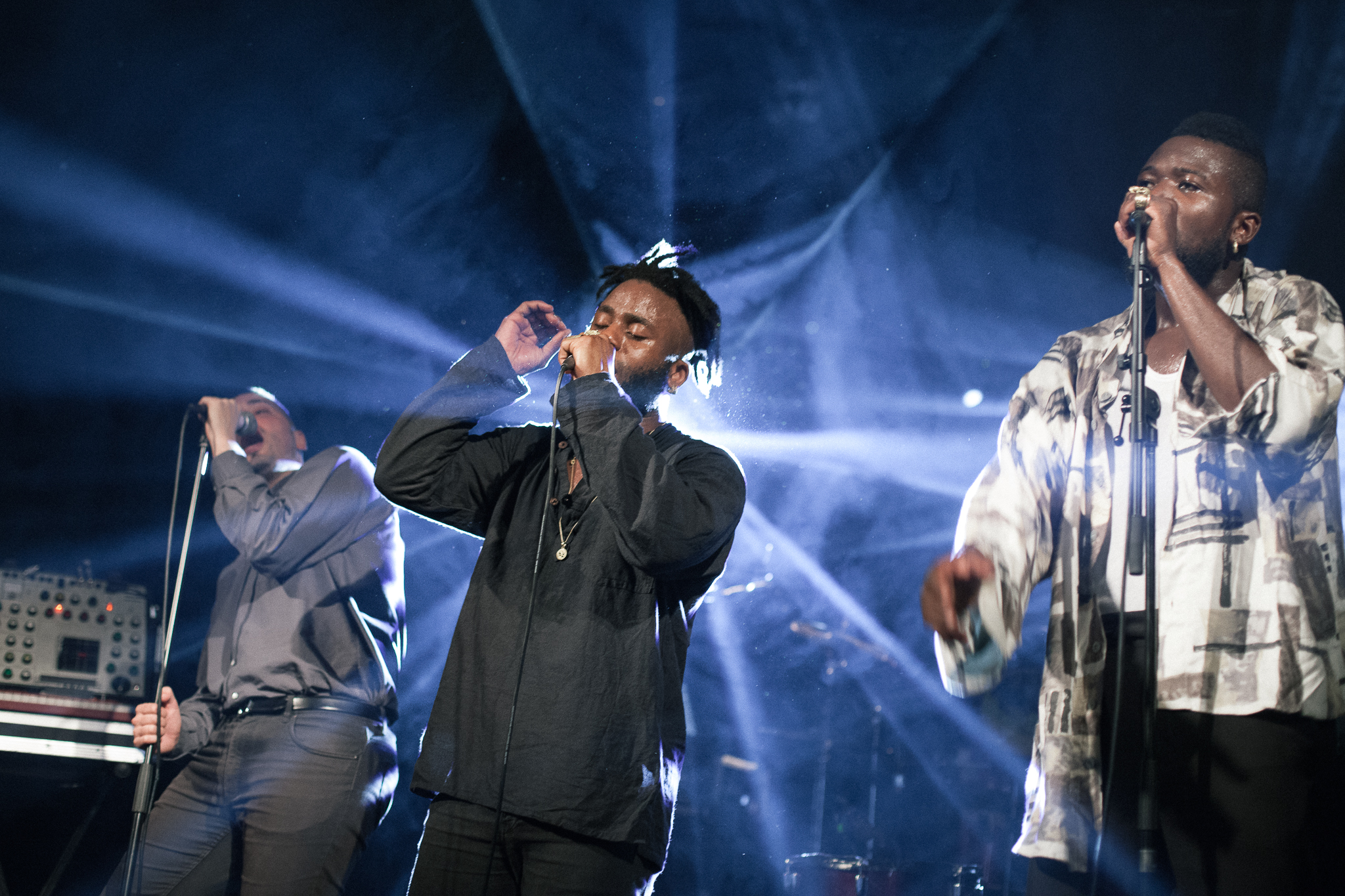 Zu Recht wurden die Schotten Young Fathers als Höhepunkt der Pop-Reihe des Festivals angekündigt, wieder aus den ersten Reihen konnten wir die Show mitverfolgen und vor allem mittanzen. Uns bot sich postmoderner Soul, ein energetisches Set mit viel Körper- und Tanz-Lust der vier Akteure. Die Tiefe eines Otis Redding flackerte durch die Gesangsparts von Alloysious Massaquoi, während Kayus Bankole bei den schnelleren, härteren Nummern um sein Leben tanzt, der Schlagwerker Steven Morrison sich hyperaktiv die Seele aus dem Leib trommelt und ‚G‘ Hastings Ungeahntes aus dem Zylinder des Synthesizers holt. „We Are All Migrants“ ist die Botschaft der gesamten Tour, und es stimmt, sind wir nicht alle von irgendwo irgendwann irgendwie? Mit Schweiß, Lächeln, Kraft, Stärke und Stimme wird das Motto an das Publikum gebracht, es ist politisch, es ist Hip Hop, es ist Gospel. Aber ohne Religion, eher mit irdischen Themen befassen sich die Young Fathers und bieten mit ihrem kraftvollen Auftritt wohl eines der interessantesten Konzerte des Jahres 2015.