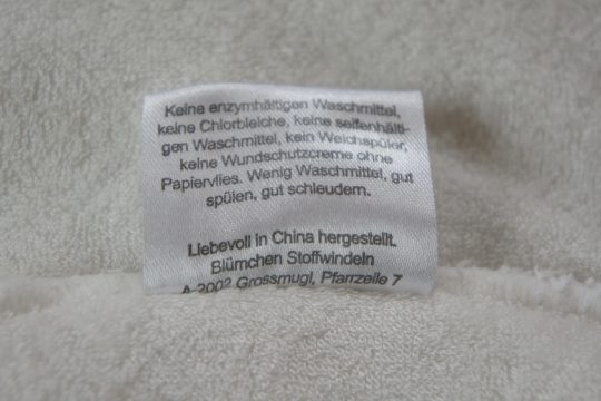 Hier gibt’s ein breites Spektrum: von der 100-Prozent-Kunstfaser-Windel Made in China bis zur GOTS-zertifizierten Baumwollwindel, die zur Gänze in der EU gefertigt wird. Was ich dazugelernt habe: Bambus ist immer quasi bio, weil er so anspruchslos wächst, dass an ihm keine Pestizide verschwendet werden, wird aber zu Viskosefasern verarbeitet, was energie- und chemikalienintensiv ist. Und Baumwolle ist extrem bewässerungsintensiv, auch in Bio-Qualität, wenngleich die schon generell umweltfreundlicher ist. Am ökologischsten ist Hanf, daraus gibt es aber meines Wissens noch keine Windeln, nur Extra-Saugeinlagen. Skurril finde ich – und lasse es unkommentiert – einen Hinweis in Richtung soziale Nachhaltigkeit auf einigen Windeln der Firma Blümchen: „Liebevoll in China hergestellt.“