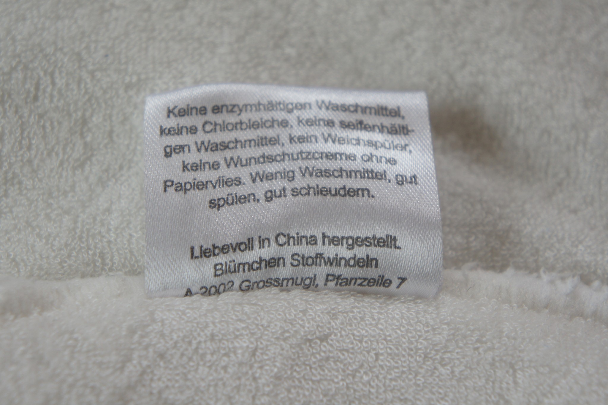 Hier gibt’s ein breites Spektrum: von der 100-Prozent-Kunstfaser-Windel Made in China bis zur GOTS-zertifizierten Baumwollwindel, die zur Gänze in der EU gefertigt wird. Was ich dazugelernt habe: Bambus ist immer quasi bio, weil er so anspruchslos wächst, dass an ihm keine Pestizide verschwendet werden, wird aber zu Viskosefasern verarbeitet, was energie- und chemikalienintensiv ist. Und Baumwolle ist extrem bewässerungsintensiv, auch in Bio-Qualität, wenngleich die schon generell umweltfreundlicher ist. Am ökologischsten ist Hanf, daraus gibt es aber meines Wissens noch keine Windeln, nur Extra-Saugeinlagen. Skurril finde ich – und lasse es unkommentiert – einen Hinweis in Richtung soziale Nachhaltigkeit auf einigen Windeln der Firma Blümchen: „Liebevoll in China hergestellt.“
