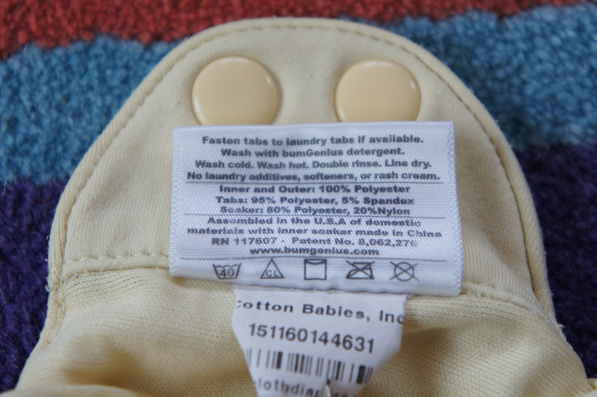 Die einwegwindeligste aller getesteten Stoffwindeln. AIO-Windel mit einklappbaren Einlagen. 100 % Kunstfaser, außen PUL, die Einlagen sind aus 80-%-Polyester-20-%-Nylon-Mikrofaser. Deutlich saugstärker als die Elemental, als Nachtwindel habe ich aber auch sie nicht probiert. Wahlweise mit Druckerl oder Klett. Mitwachsend. Schnell trocknend. „Assembled in the USA of domestic materials with inner soaker made in China.“