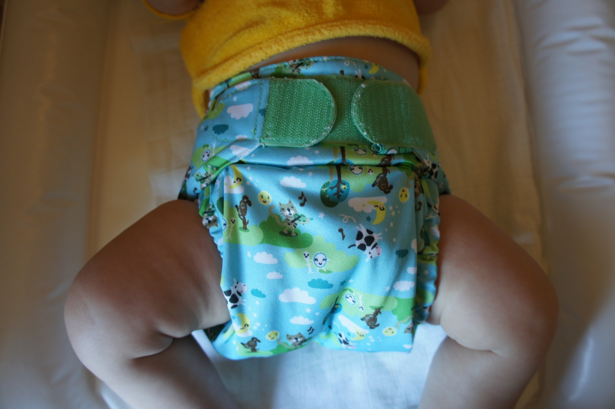 Für mich wenig praktische All-in-one-Windel mit einer Tasche zum Hineinstopfen der Einlage (im Test eine aus 90 % Bambusviskose und 10 % Polyester). Nässeschutzmembran aus PUL. Verursacht Druckstellen. Mit nur einer Einlage wenig saugfähig, als Nachtwindel daher nicht getestet. Wahlweise Kletter oder Druckerl. Mitwachsend. Trocknungszeit je nach verwendeter Einlage. „Liebevoll in China hergestellt.“