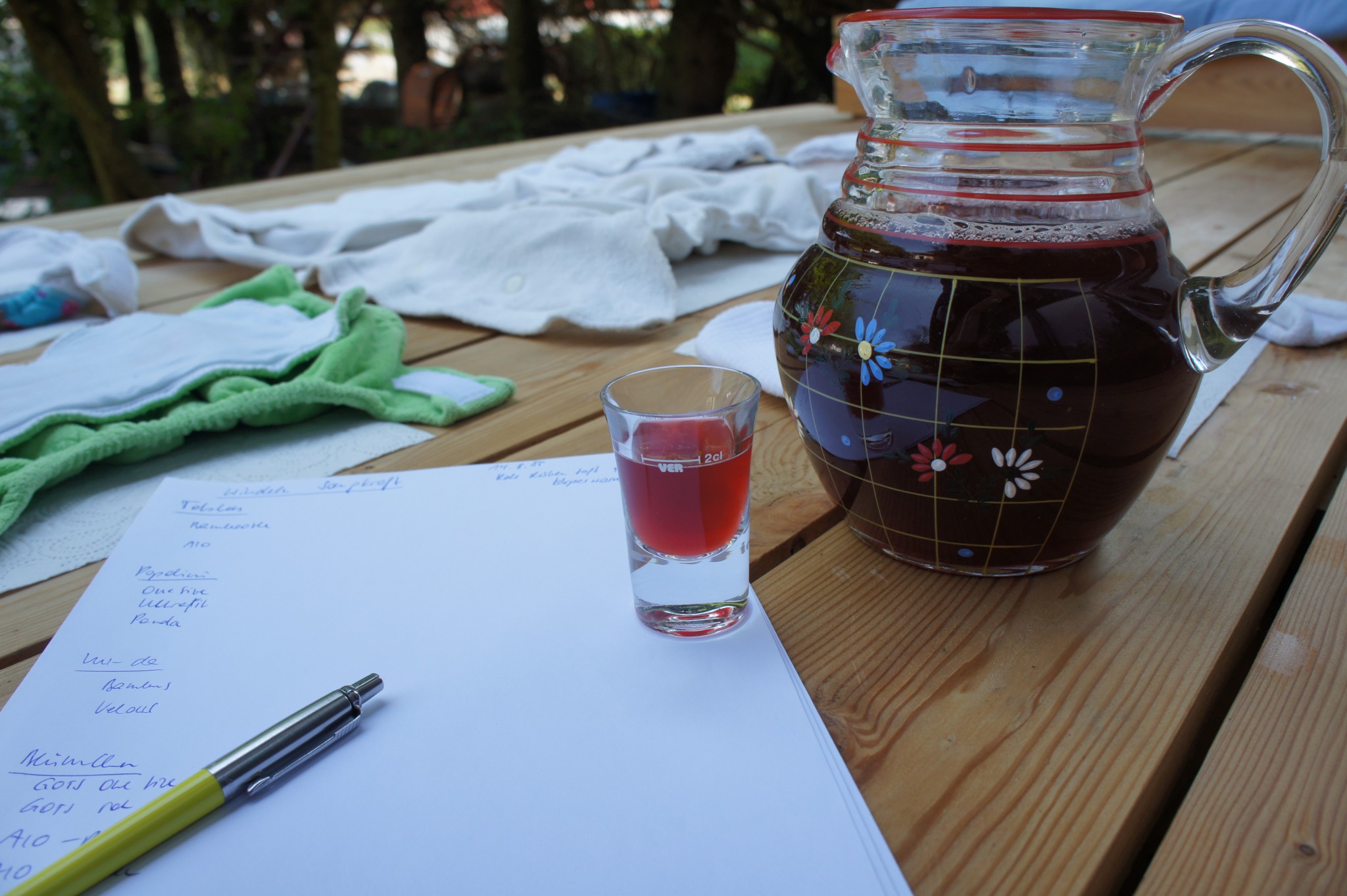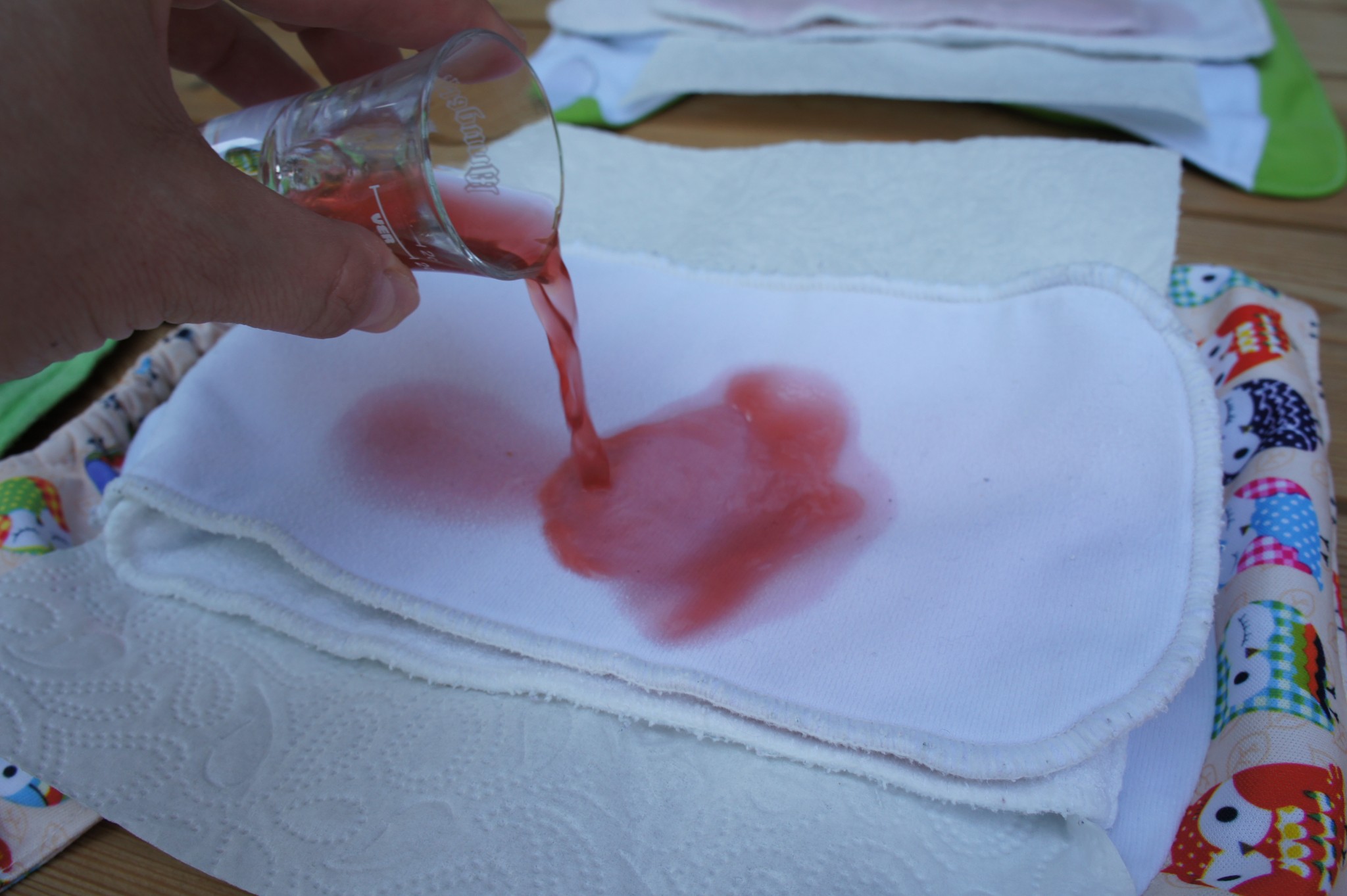 - Saugkraft*: getestet in vivo sowie in einem aufwändigen, hochwissenschaftlichen Quasi-in-vitro-Verfahren mit körperwarmem Rote-Rübensaft (geht beim Waschen rückstandslos raus), stamperlweise bis zu einer Gesamtmenge von je 200 ml auf die Windeln aufgebracht und nach je fünfminütiger Einziehzeit zunächst optisch (Durchnässen) und danach haptisch (Oberflächengefühl) ausgewertet (zweiteres als Kriterium für Komfort). Sofern zusätzliche Saugeinlagen zum jeweiligen Windelsystem dazugehören, habe ich in vitro inklusive dieser, in vivo mal so, mal so getestet. Zwei-Komponenten-Systeme kamen in vivo in verschiedensten Hersteller-Kombinationen zum Einsatz.