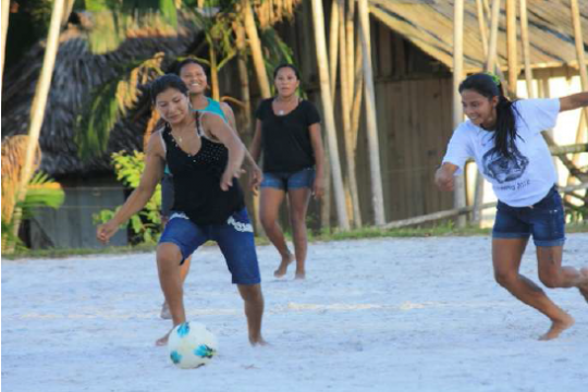 Als Kontrastprogramm zur Fußball-WM in Brasilien lud das Klimabündnis uns ein, Fußball wie in Amazonien zu spielen, barfuß und mit anschließendem Flussbad. Den Ankick machte Almerinda ...