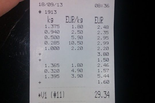 … die Rechnung (und wie wir das ganze Zeug nach Hause schaffen). Liebe Billy! Mittwoch ist Wochenmarkt! Unser Gemüse ist alle. Das erste Mal, dass ich WIRKLICH etwas kaufen muss, ...