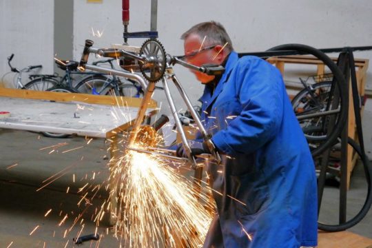 Anfangs mussten sich die drei Möbelbauer die Fahrradrahmen noch bei Zweiradhändlern erbetteln. Mittlerweile gibt es eine Kooperation mit den Wertstoffhöfen des Kreises Gütersloh.