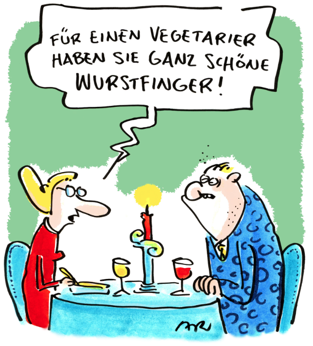 Die neue Ausstellung „Vegane Cartoons“ in der Galerie der Komischen Künste präsentiert die Arbeiten verschiedener Künstler und Künstlerinnen zum Thema veganes Leben. Die Ausstellung ist Antwort auf Fragen wie „Können Vegetarier auch Wurstfinger haben? Gibt es neben Paniertem Salat noch andere fleischlose Leckereien in Dorfwirtshäusern? Und wie sieht eigentlich ein Grabstein für Veganer aus?“.