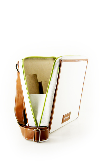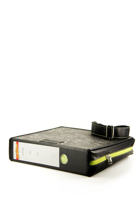 Die Idee kam den diplomierten Taschendesignern Tobias Förtsch und Carsten Fichtel beim Ausmisten ihrer WG. Die Aktenordner sind nicht die einzigen, die der Digitalisierung von Daten zum Opfer gefallen sind. Wegschmeißen wollten sie die jahrelangen Dokumentenhüter dennoch nicht und retten nun auch viele andere Aktenordner vor dem Verbrennungstod. Büros und Privatleute, die ihre Archive ausrangieren, sind ihre größten Lieferanten. Recycling im kleinen, feinen Stil. Die Kartonordner werden imprägniert, damit das Innenleben der zukünftigen Tasche ja nicht überflutet wird, und dann mit Lederstücken zu einer Umhängetasche zusammengenäht und -genietet. Robustes und klares Design ist das Credo von ad:acta. Jede einzelne Tasche wird per Handarbeit in einer bayrischer Näherei zusammengeflickt. Den Labelgründern war es ganz besonders wichtig, dass auf ihren Taschen „Made in Germany“ und nicht „Made in China“ steht.